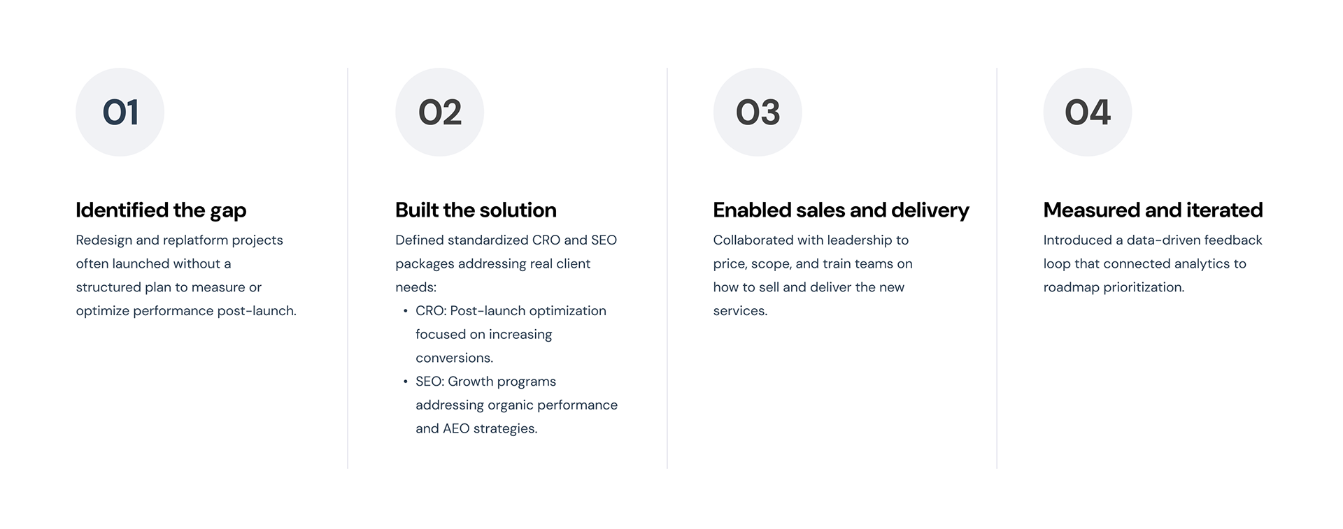 A lot of our projects ended at the point of delivery, even though there was clear potential to keep improving performance post-launch. In partnership with the team, I started shaping what these next-phase services could look like, specifically around CRO and SEO. Drawing from my experience leading website strategy and analytics in previous roles, I began packaging these services into defined programs that helped clients measure, optimize, and grow their results after a redesign or replatform.